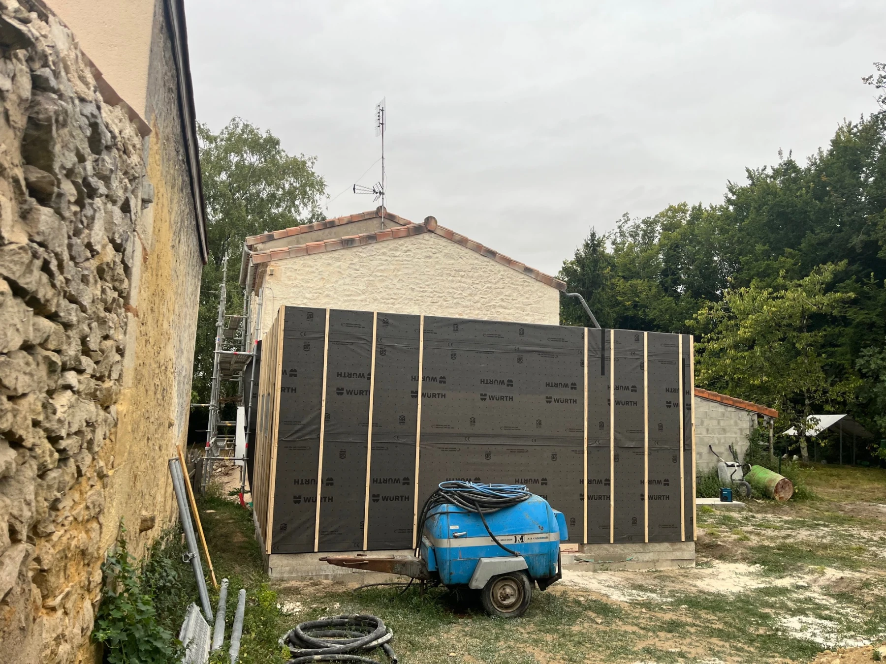 Taille +assemblage des murs en ossatures bois 45mm x 145 mm isolés en laine de bois de 145 mm avec contreventement en osb 12 mm mis sur la face extérieur+ pare pluie.
