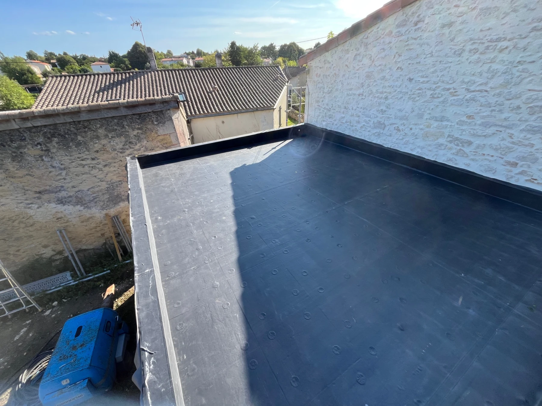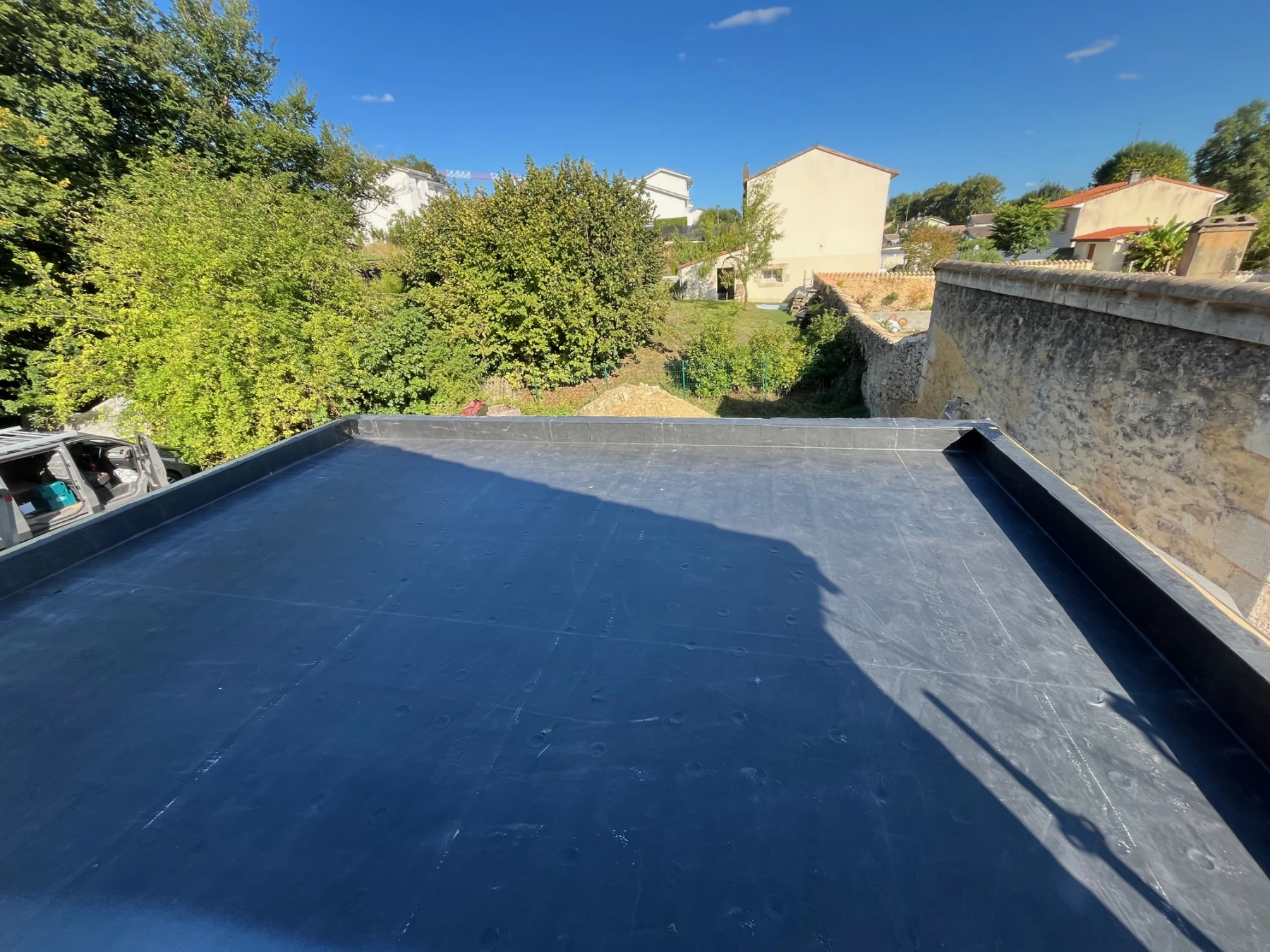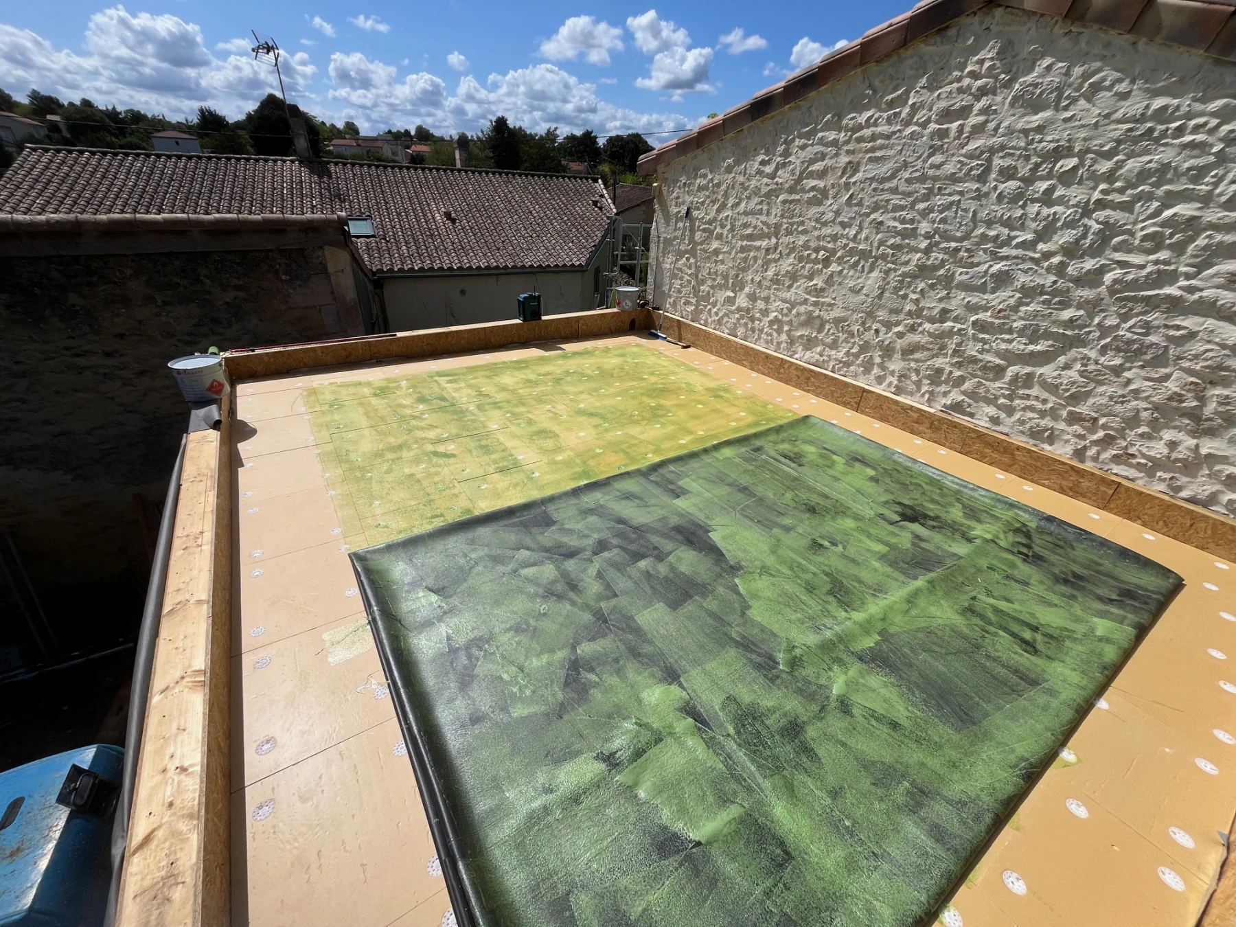 Le toit terrasse a été réalisé avec une membrane epdm , un isolant rigide ( carré de mousse polyhurèthane de 60 mm d'épaisseur)sous la membrane. Une isolation en laine de bois de 200 mm est posé sur le plafond coté intérieur.
